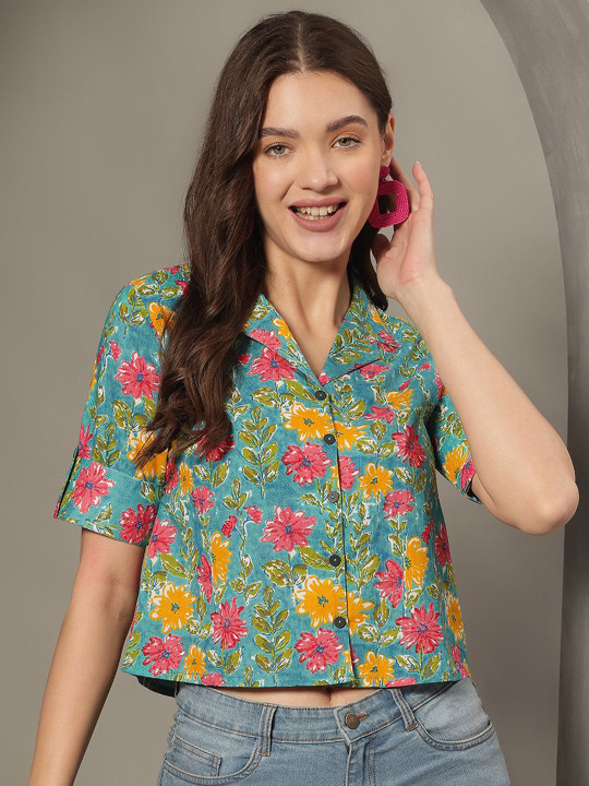 Sea green crop shirt style top