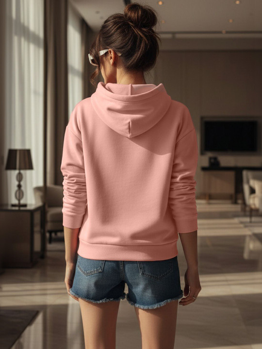 Pink printed sweatshirt has a hooded, 1 kangaroo pocket pockets, long sleeves, zip closure, ribbed hem
