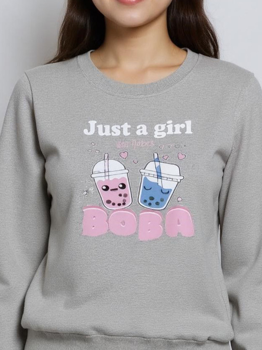 Grey printed sweatshirt has a round neck, pockets, long sleeves, closure, ribbed hem